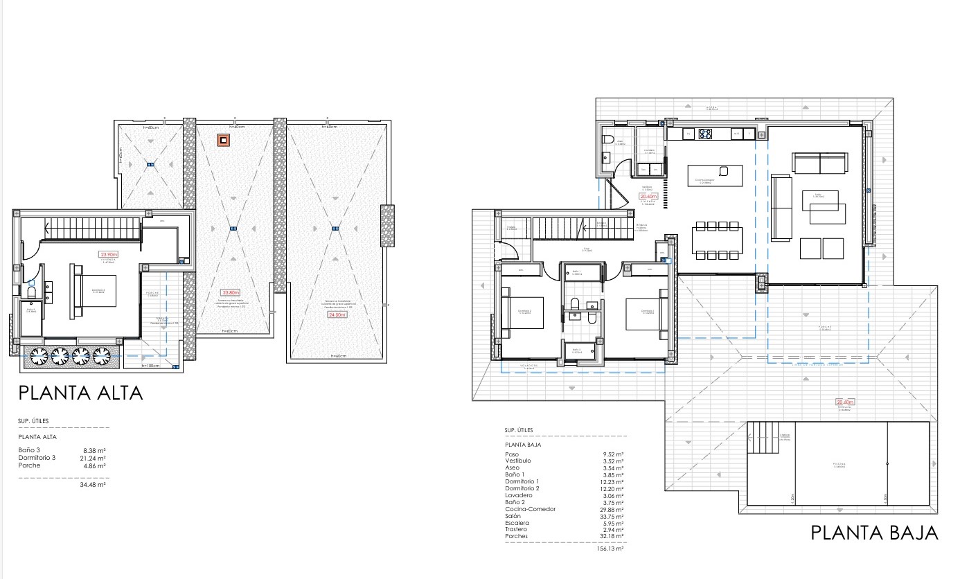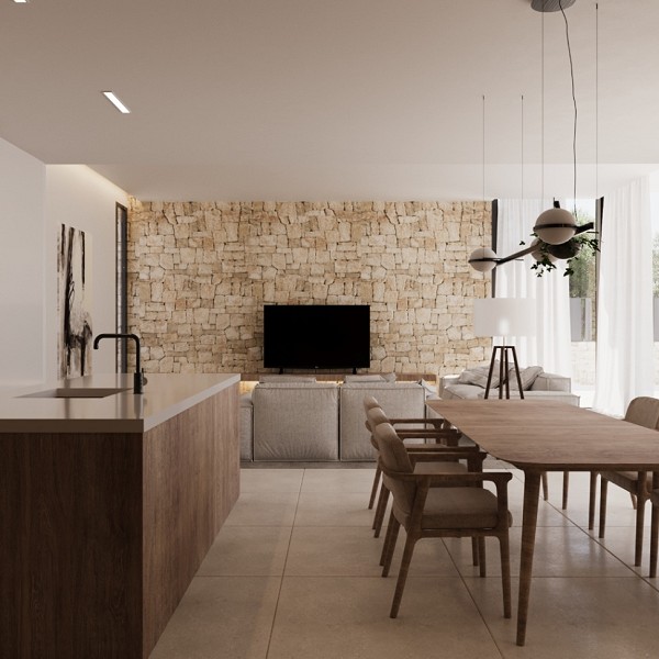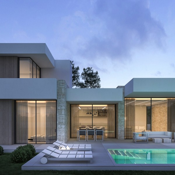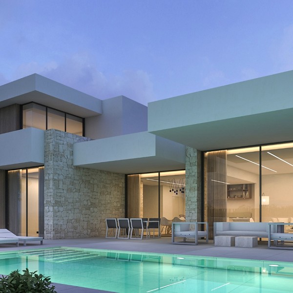 Every home in Luxury Village Dénia has been conceived as a unique work of art, where the purity of the lines, the expanse of the windows, and the selection of noble materials—large format porcelain from Saloni, Porcelanosa fittings, Technal carpentry, and high-efficiency finishes—guarantee an exceptional residential experience.