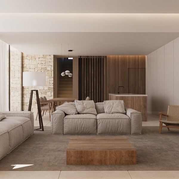 The exterior is an invitation to enjoy year-round: a private pool of 36 m², spacious sunny terraces, and covered porch areas create different environments for relaxation, socializing, and contemplation. The natural stone walls, native landscaping, and architectural wooden details give the villa a warm Mediterranean identity, fully integrated into its surroundings.
