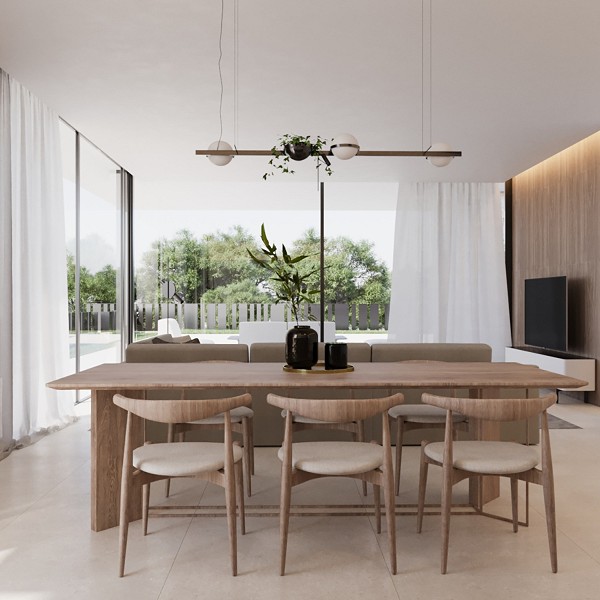 The villas, with clean lines and balanced volumes, are distributed over one or two floors, with large windows that flood the spaces with light and seamlessly connect the interior with the exterior.